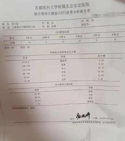 1. 关于 " 智障 " 的诊断结果很多人都在问,为什么一个能考上高中的孩子会被测出智障。这里给大家说明白:当时做智力测试时,因为题目量很大、诊室环境嘈杂,加上我本身注意力很难集中(这也是我去就医的核心原因),最终出来的 69 分只是一个受状态影响的参考值,并不是最终诊断。接诊的医生也明确跟我说,这个结果不能代表我的真实智力水平,更不能直接判定为智力障碍。
