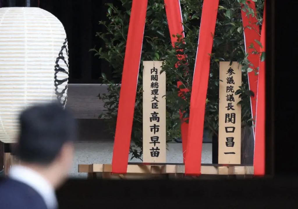 4 月 21 日,高市早苗以 " 内阁总理大臣 " 的名义,向靖国神社供奉名为 " 真榊 " 的贡品。