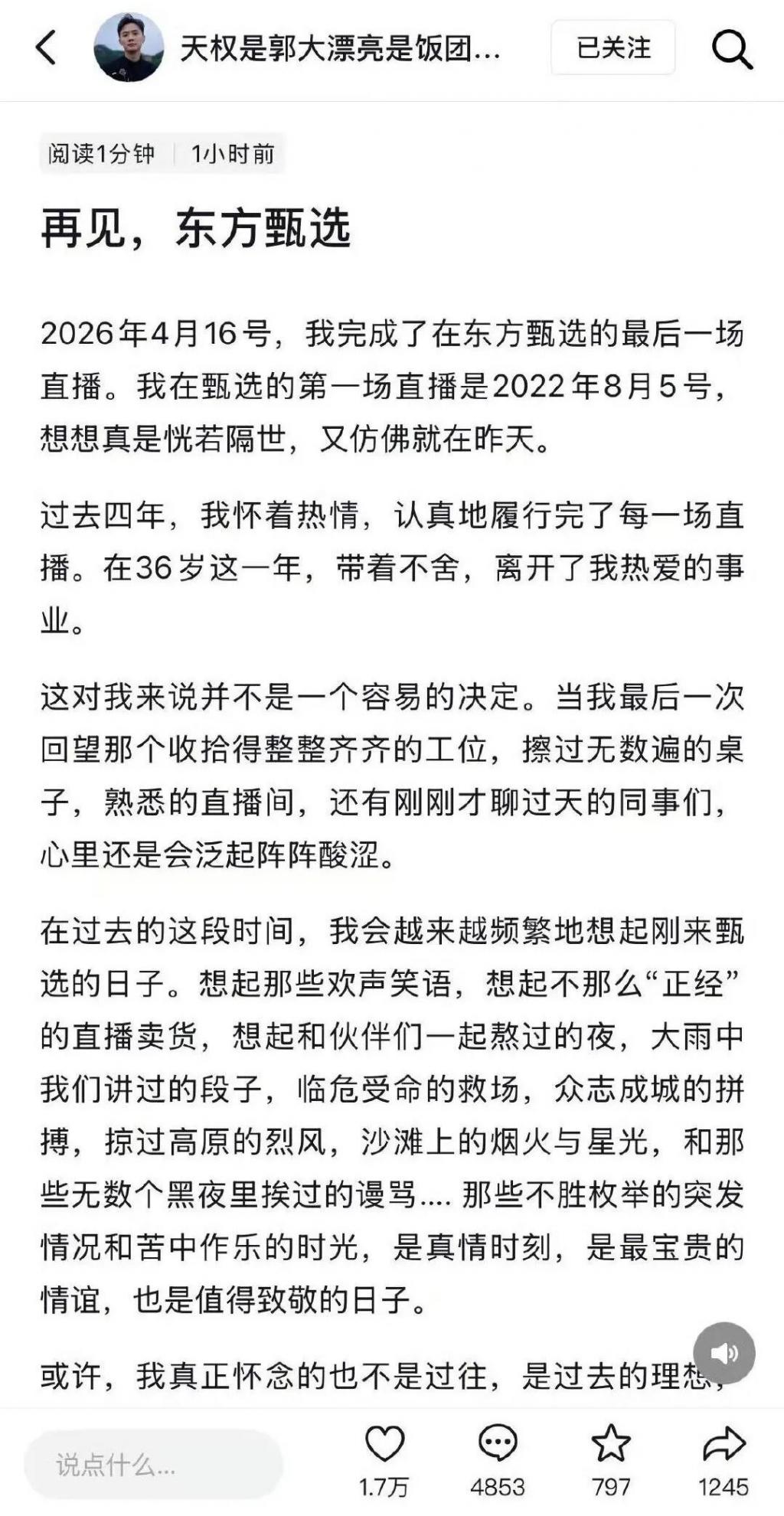 4 月 25 日下午,东方甄选 4 名主播明明、天权、中灿、林林陆续在个人社交平台发长文宣布,离开东方甄选。