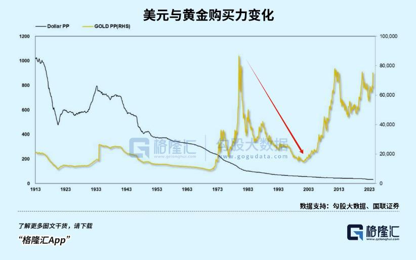 80 年代到 21 世纪初,美国物价上涨超过 5 倍,即美元的购买力贬值了 5 倍;相同时间段内,以美元计价的黄金价格,却几乎没有变化。
