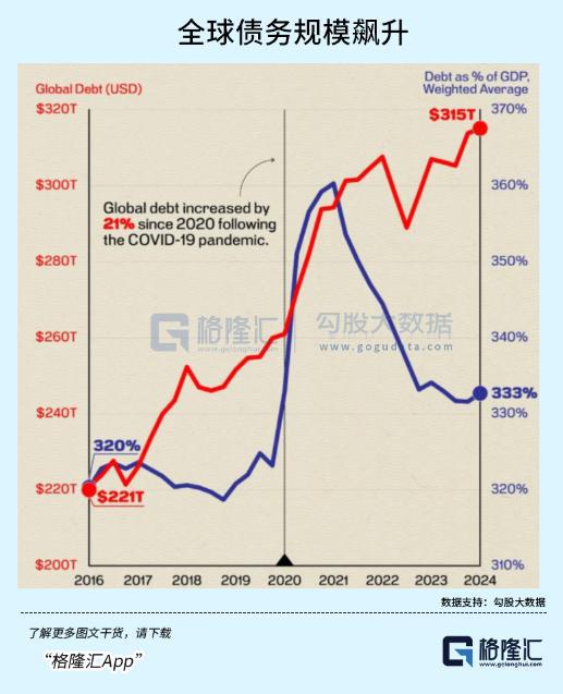 而从 2019 年至 2024 年 12 月,五年之内,全球债务规模飙升了 20% 以上,总规模达到 318 万亿美元,比前一年增加 7 万亿美元,与全球 GDP 之比飙升至 328%,比上一点增长 1.5%。