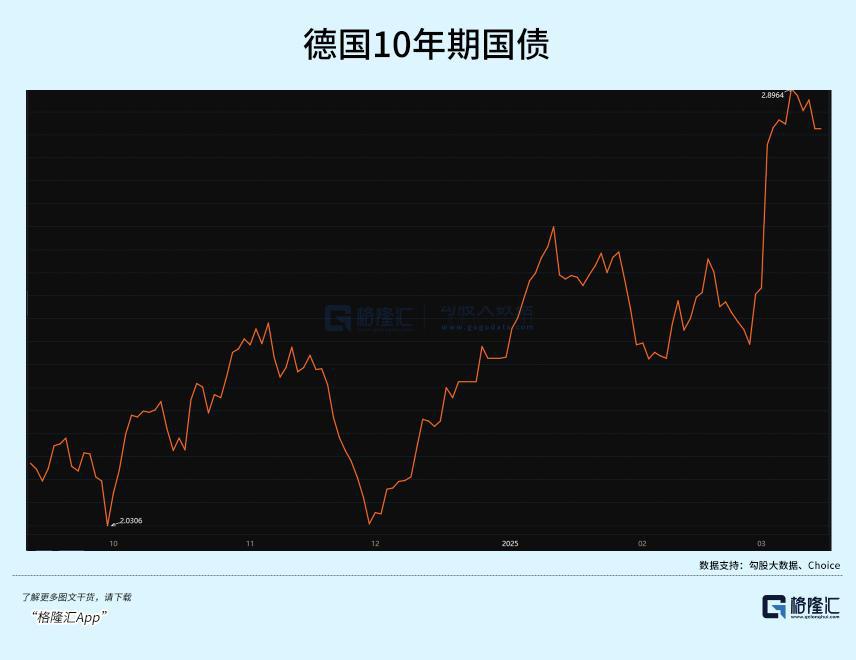 消息宣布当天,德国 10 年期国债收益率飙升近 30 个基点,创 1990 年两德统一以来最大涨幅。