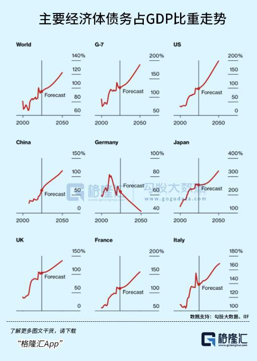 看下图,根据 IIF 的预测,全球主要经济体中,除了德国,政府债务的增速都将越来越快,最健康的在 2050 年之前占 GDP 比重也会超过 100%。