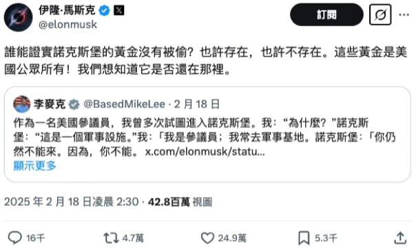 马斯克也回复了这条帖子:谁能证明里面的黄金没有被偷?
