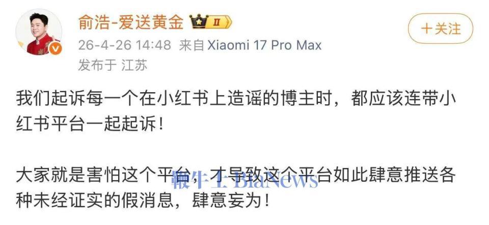 随即,他又发文称:" 我们起诉每一个在小红书上造谣的博主时,都应该连带小红书平台一起起诉!大家就是害怕这个平台,才导致这个平台如此肆意推送各种未经证实的假消息,肆意妄为!"