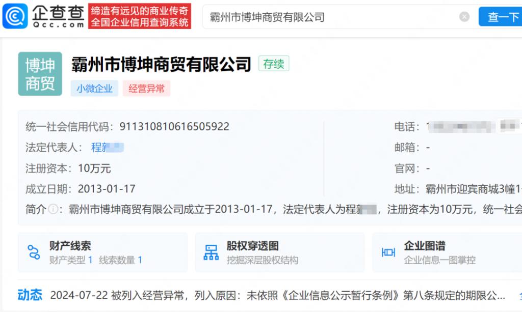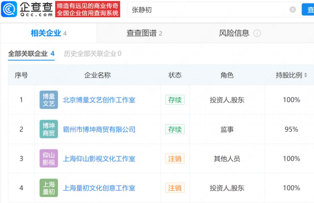查询企查查发现,张静初名下共关联 4 家公司,仅霸州市博坤商贸有限公司、北京博量文艺创作工作室为存续状态,其余两家个人独资工作室已注销。值得注意的是,2024 年 7 月,霸州市博坤商贸有限公司因未按规定公示年度报告被河北省廊坊市霸州市市场监督管理局列入异常经营名录。