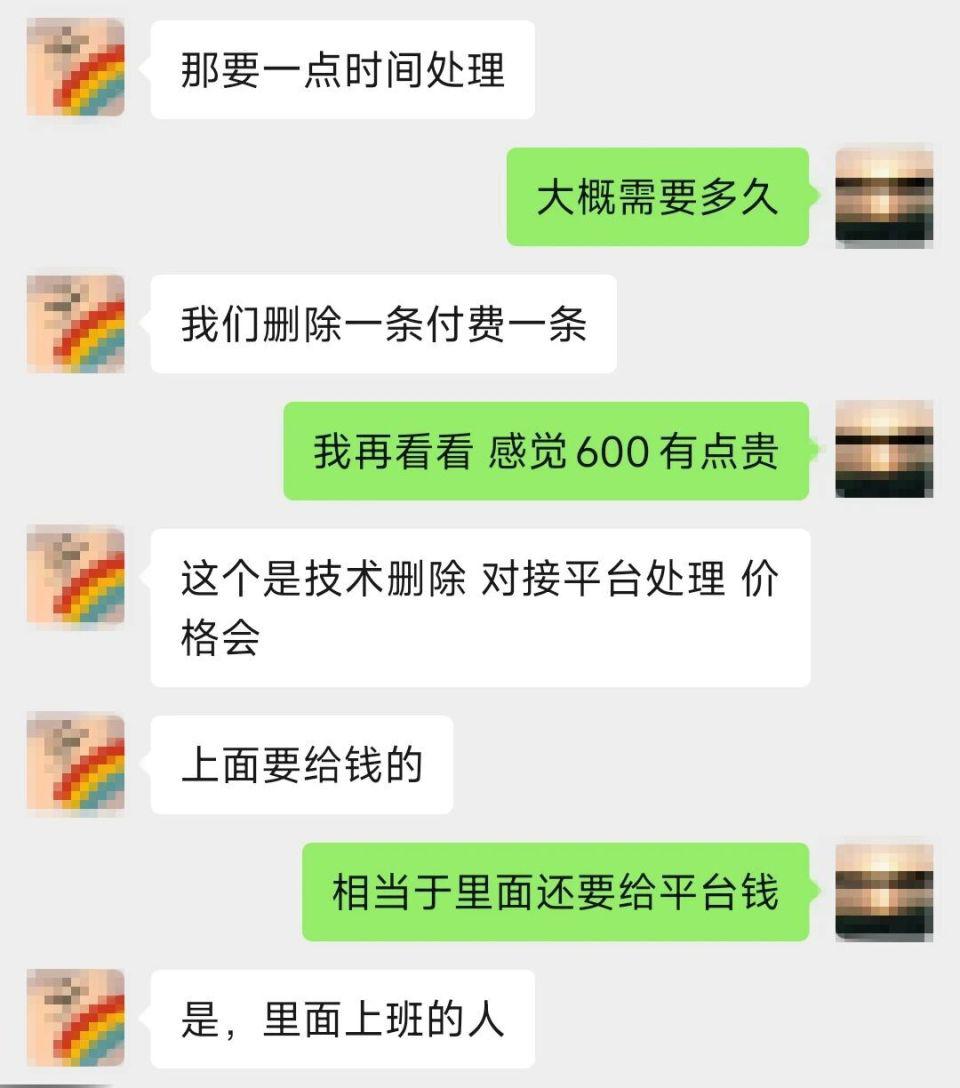 但也存在例外情况。沟通中,有删评人坦言,如果差评被删除,消费者会收到 " 评价违规不做展示 " 的平台提示。对方还称,他们会对接平台,通过技术手段删除差评," 删除一条付一次费,单条价格 600 元,我们会把钱付给平台内部人员,由他们操作删除 "。