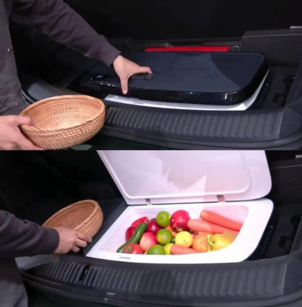 车身前面深藏不露,后面更是暗藏玄机,后备仓底部配备了一个 " 大冰柜 " 与车载厨房搭配使用。李斌现场所用食材,自然全都来源于这个 " 大冰柜 "。