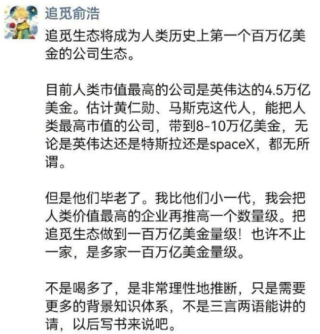 今年年初,俞浩在朋友圈上发出 " 豪言 ":追觅生态将成为人类历史上第一个百万亿美元的公司生态。
