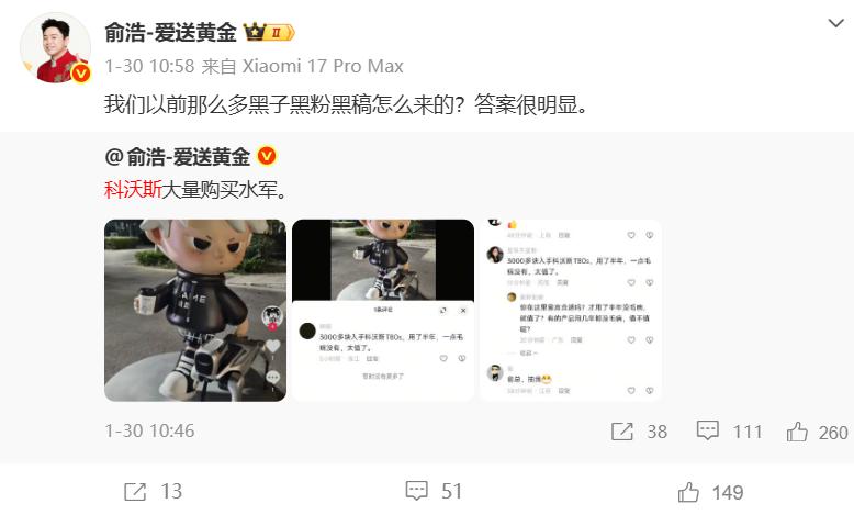 今年 1 月底,俞浩在社交平台连发 6 条动态,点名指控科沃斯 " 大量购买水军 ",并称此前追觅的直播间曾遭遇有组织、系统性的刷屏抹黑言论,导致直播间崩溃。