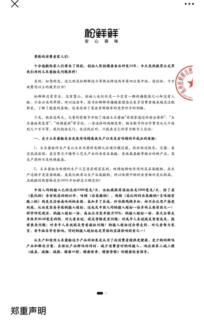 在此前一天,松鲜鲜已在其官方公众号上做出声明,对“玉米酱粉”的成分及工艺进行解释,并对其安全性予以例证。然而它仍需要通过直播跟更多消费者沟通。