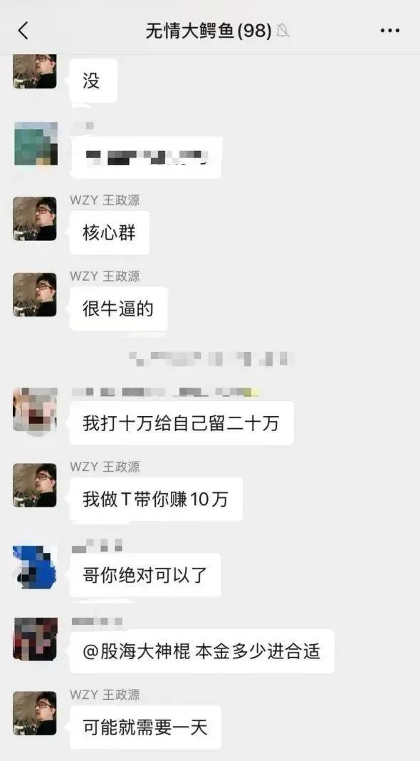 " 我做 T 带大家赚 10 万 "" 核心群,很牛逼的 "…… 王政源在群里发出了这样的信息,让人相信可以通过他的超级短线操作,获得极高的收益。看到这些消息,群友纷纷喊他," 富哥 "" 富爹 "" 大哥 "。