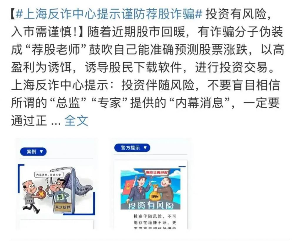 上海反诈中心曾于 2024 年 10 月提示谨防荐股诈骗