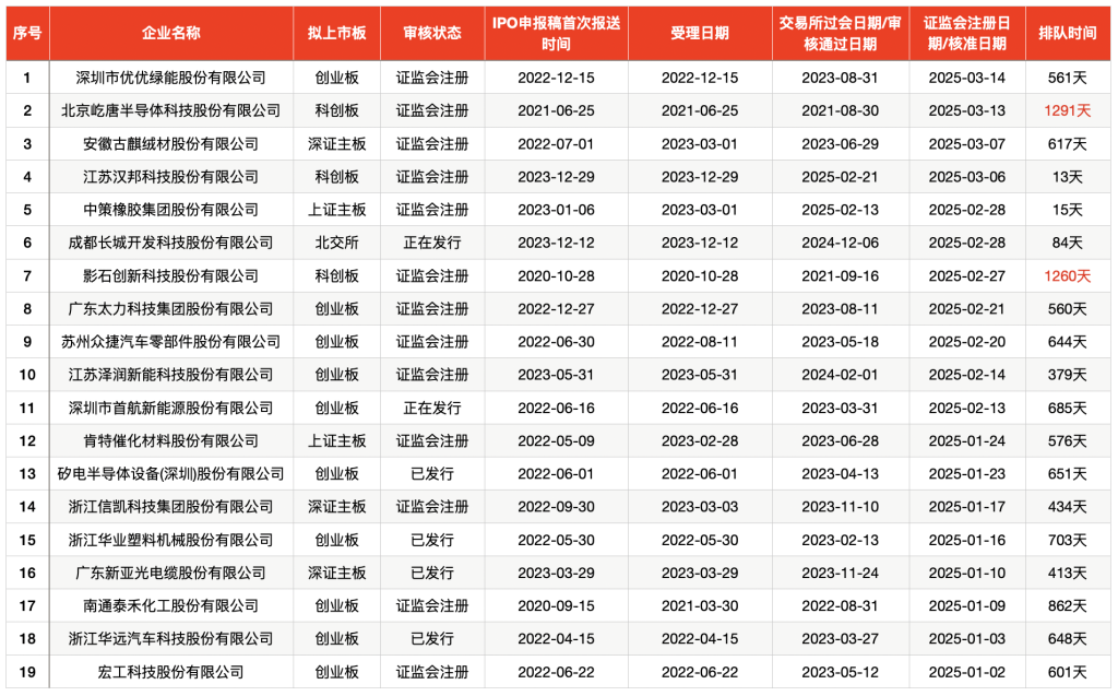 其中,屹唐股份、影石创新科技股份有限公司(简称“影石创新”)为知名IPO“钉子户”,过会后排队时间长达三年以上。其中,屹唐股份审核周期最长高达1291天,影石创新的排队时间为1260天。