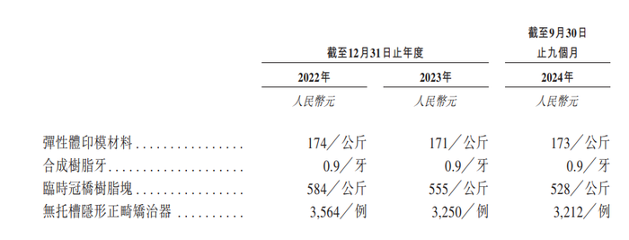 其中,弹性体印模材料为单一占比最大的产品,2022年至2024年前三季度分别占比36.4%、36.6%和37%,同期销售价格分别为174/公斤、171/公斤、173/公斤。