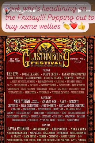 丹尼斯分享了一张阵容海报的照片,上面显示马蒂的乐队将于周五在金字塔舞台上表演,她写道:“看看谁是周五的主角!!出去买靴子了。”她还在自己的微博上配了同一张照片:“我想这是我第一次去英国参加音乐节了!!”