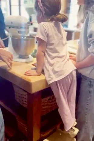 在这段甜蜜的视频中,可以看到梅根和一个好奇的三岁小莉莉贝特一起准备曲奇饼,她站在台阶上,看着厨房柜台的电动搅拌器。视频中,梅根在好友凯莉·麦基·扎芬和为梅根设计婚纱的时装设计师克莱尔·维特·凯勒的帮助下,把面团揉成小饼干,哈里在旁边看着。