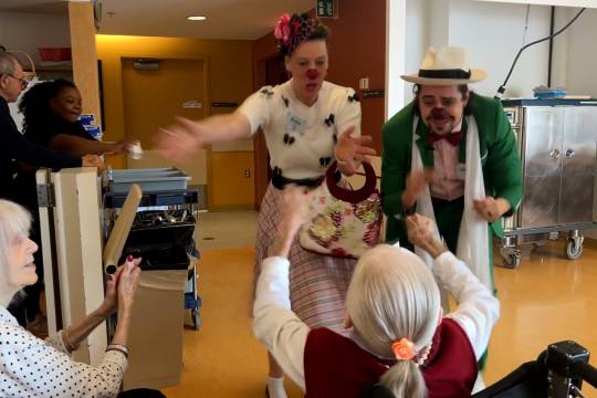 治疗小丑罗茜和利奥波德在蒙特利尔一家医院向老年人传播快乐