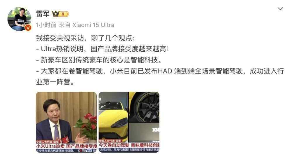 对于新能源车出海和订单激增问题,雷军表示:" 目前在全球考察各地市场和各地政策,筹备在合适时候出海。第一焦点问题是解决国内订单排队 6-7 个月的问题,如何扩产的问题。" 首款高端电动车型 SU7 Ultra 的热销,印证国产品牌市场认可度提升。雷军指出,新豪车颠覆传统的关键在于智能科技,大家都在 " 卷 " 智能驾驶,小米现自研 HAD 端到端全场景智驾系统已跻身行业第一阵营。
