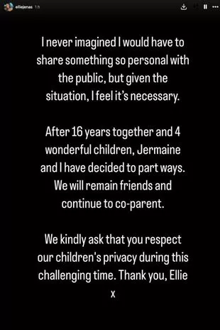 这位三个孩子的母亲写道:“我从没想过我会和公众分享这么私人的东西,但考虑到这种情况,我觉得这是必要的。在一起16年,育有4个可爱的孩子之后,杰梅因和我决定分手。我们仍然是朋友,并将继续共同抚养孩子。”