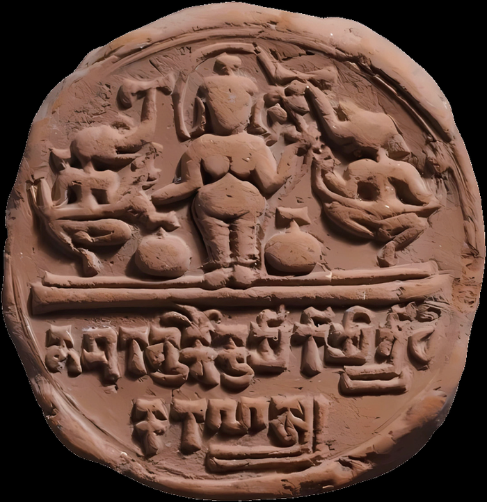 印度封泥上的莲花也见于菩萨诞生的图案(吉祥天灌顶)。在这种图案(图8)中,一个站立或端坐的女性(通常认为是吉祥天女),被两头象按照灌顶仪式浇沃。灌顶是一种洗礼、启蒙和仪式性的沐浴,经常在国王登基时举行,《佛本生经》常有记载。因此,灌顶本身就有象征王室和王权之意。吉祥天灌顶的图案所刻画的女性身旁有一头或两头象,这代表了释迦牟尼的诞生。这种表现常辅以一个盛水器和一枝莲花,或仅限于容器中的一枝莲花。需要澄清的是,这类图案是否确切代表菩萨诞生尚存争议,但印度代表生育和好运的古代符号——女性神祇、母神、象、莲花、容器、圣水——很有可能代表一种神圣的诞生仪式。