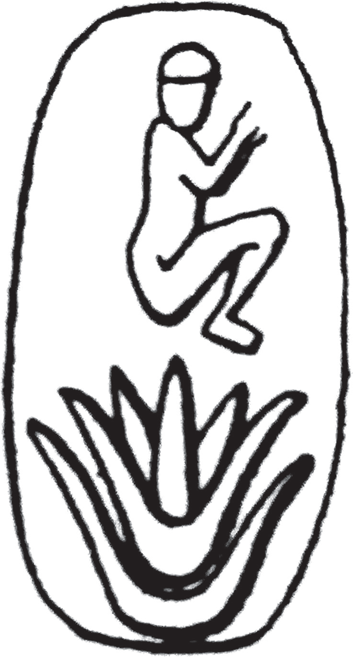 人们在伊拉克的尼姆鲁德发现了一枚极具趣味的椭圆印记(大约在公元前7世纪末前)。印记是一名裸体儿童蹲踞在一朵莲花上,也可看成儿童从莲花里雀跃而出(图7)。学者们注意到这个形象的古埃及来源,认为“最有可能来源于在叙利亚象牙制品中常见的荷鲁斯诞生的意象”。这个图案似乎与在尼尼微发现的一块泥版文书上的莲上男童图案相同。但在尼尼微发现亚述人崇拜的版本,说明“婴儿荷鲁斯已被纳入刻印者的知识范畴,这无疑受到了叙利亚元素的影响”。而这些叙利亚元素,毫无疑问源自古埃及。前述莲上的荷鲁斯四子和莲上的儿童图坦卡蒙就是两个原型,它们从形式到内涵都被各地的后来者模仿。