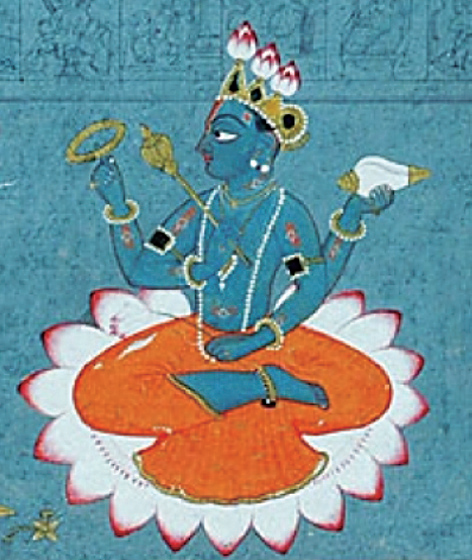 释迦牟尼和莲伴生的情节,其实可以从古印度的主神梵天(Brahmā)找到源泉。梵天是公元前7世纪左右形成的婆罗门教的主神之一,是宇宙间的造物主,人类及万物皆由他而生。梵天自身的来历也很神奇。据《提婆菩萨释楞伽经中外道小乘涅槃论》:“从那罗延天脐中生大莲华,从莲华生梵天祖公。”这是从印度的创世神话衍生出的。在宇宙将要从最初的宇宙水体中创造出来时,一朵莲花从盘坐在大蟒阿南塔(Ananta)上的毗湿奴的肚脐中伸出,莲花盛开便生下了创造者梵天,梵天随即从混沌中创造了一个有序的宇宙。莲花与梵天的联系在印度文化和生活中扮演了相当重要的角色。梵天之莲被称作“世界的最高形式和内容”。莲在印度也是太阳的符号,代表印度教万神殿的太阳神苏利耶(Surya)。“苏利耶”是梵语的“太阳”,这位太阳神也被称作“莲之主、父、王”,而印度教的另一主神毗湿奴(Visnu)则被视为太阳的人格化身;或者反过来说,太阳是毗湿奴的化身。图3莲座上的毗湿奴(或黑天)则可谓莲座上的佛的前身,体现了莲生、莲化的概念。