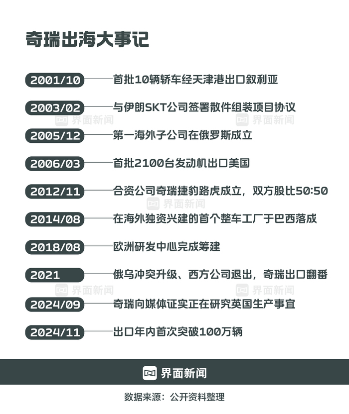 奇瑞比多数中国汽车公司更早意识到出海的重要性和价值。这不仅体现在奇瑞属于首批走出国门的中国汽车公司,还在于出口在其公司发展的时间轴上如此靠前——奇瑞的整车出口历史几乎与整个品牌历史并行。梅松林告诉界面新闻,奇瑞从初期就将企业总体发展、出海和研发放到同等地位,它今日取得的成功与这种战略定位密切相关。