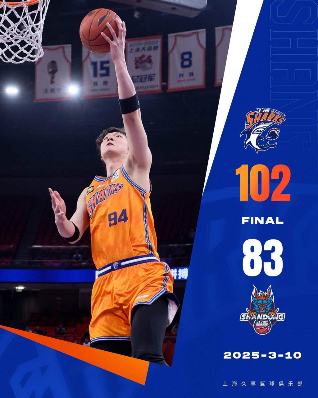 北京时间3月10日,2024-25赛季CBA常规赛,上海主场对阵山东。上海借助出色的防守限制山东一度连续两节得分不足20分,并在末节扩大15分的领先优势,最终上海102比83战胜山东收获3连胜,豪取主场14连胜,且上海近26场23胜联赛同期第一。