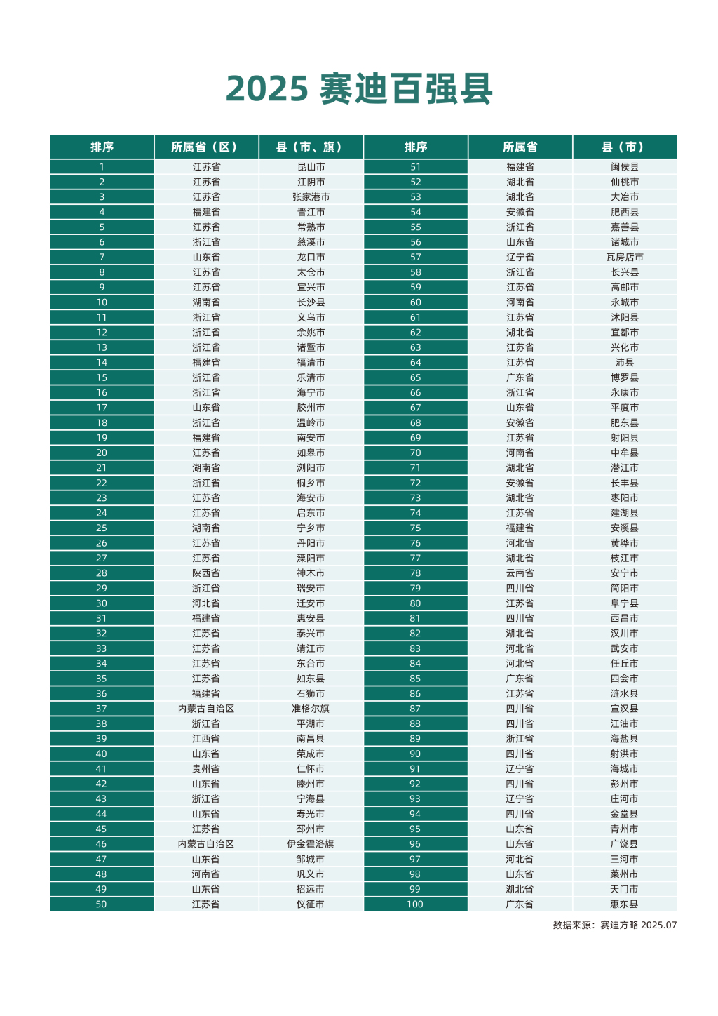 “2025赛迪百强县”发布:千亿县数量增加3个至62个,前10位江苏省独占6席