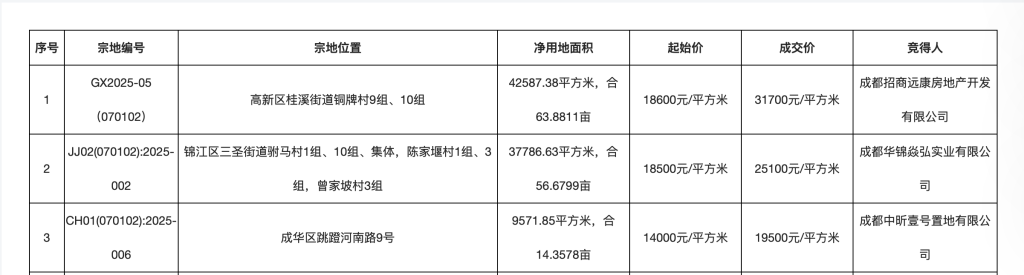 成都主城区成交3宗宅地溢价率均超30% :高新区地块楼面价超3万元成新单价地王