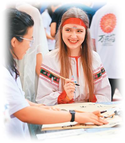 8 月 6 日," 上合之约 · 丝路津彩 " 上合国家青年学生 " 万花筒 " 文化市集在天津举行。图为青年学生体验书法。