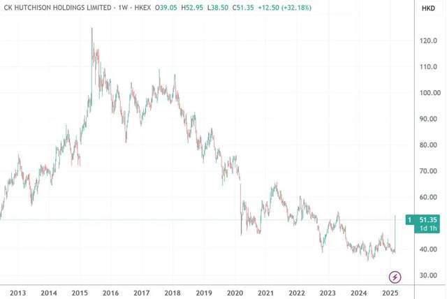 在这笔交易达成前,长和股价正处于连续 10 年的下降通道中,年线层面连续 7 年下跌。交易到手的 190 亿美元,与发布公告前的长和公司市值差不多。