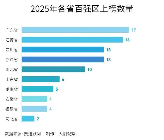 将视角放宽到百强区,广东共有 17 区上榜,江苏 16 区,浙江和四川都是 13 区,湖北 10 区,稳居前列。
