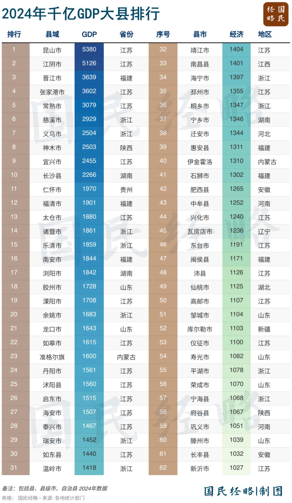 同为千亿县,昆山、江阴 GDP 双双突破 5000 亿元大关,不断刷新县域经济天花板,超过乌鲁木齐、兰州、海口等 7 个省会。