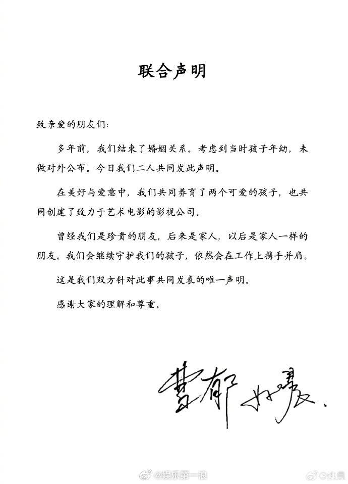 姚晨曹郁官宣离婚:多年前,我们结束了婚姻关系,考虑到当时孩子年幼,未做对外公布。...