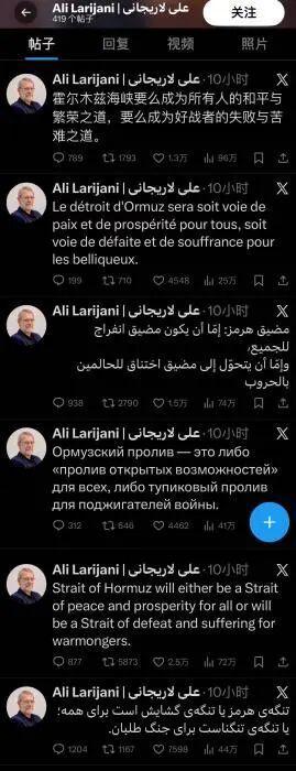 当地时间3月10日,伊朗最高国家安全委员会秘书拉里贾尼在其社交账号分别以波斯语、英语、俄语、阿拉伯语...
