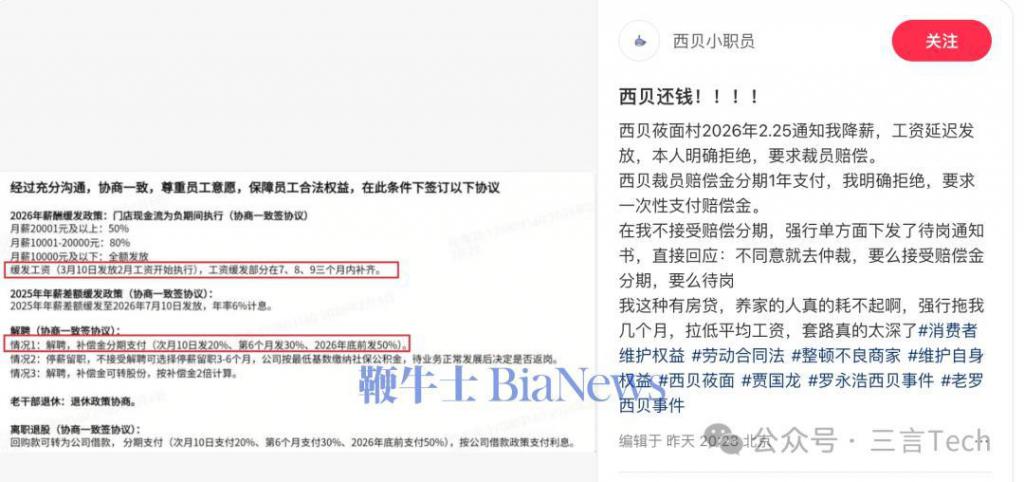 西贝被曝降薪缓发、裁员赔偿分期1年,员工拒后被通知待岗综合
