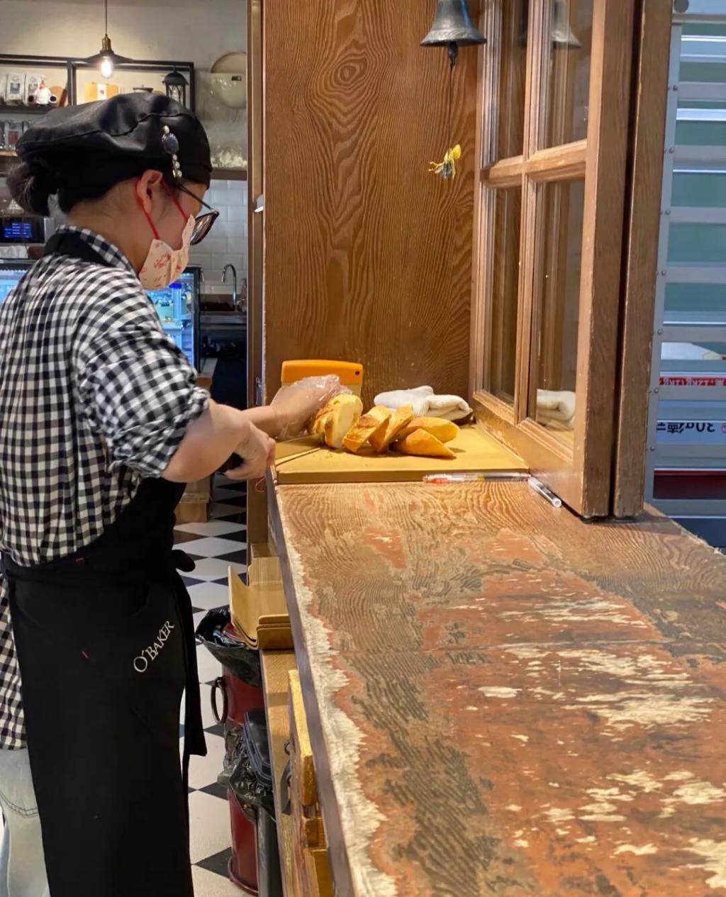 烘焙店员工用切面包的刀拆快递综合