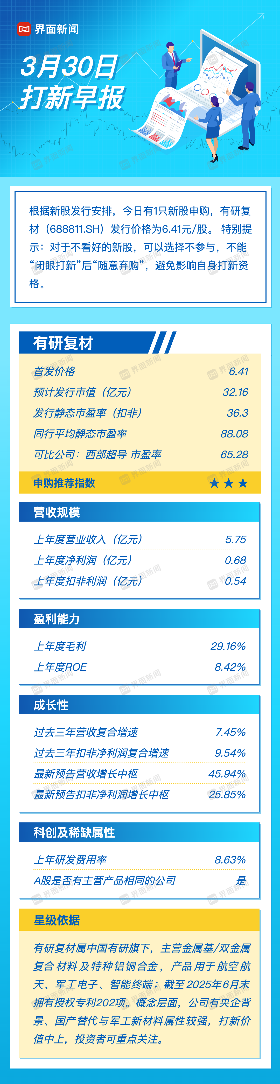 打新早报| 军工电子概念有研复材今日申购综合
