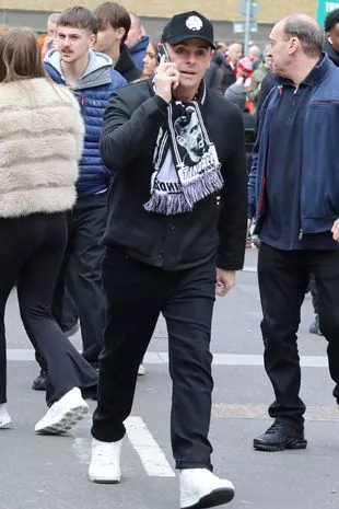 纽卡斯尔球迷安特·麦克帕特林在没有最好的朋友德克兰·唐纳利的情况下展示了他的足球骄傲,他和球迷一起排...