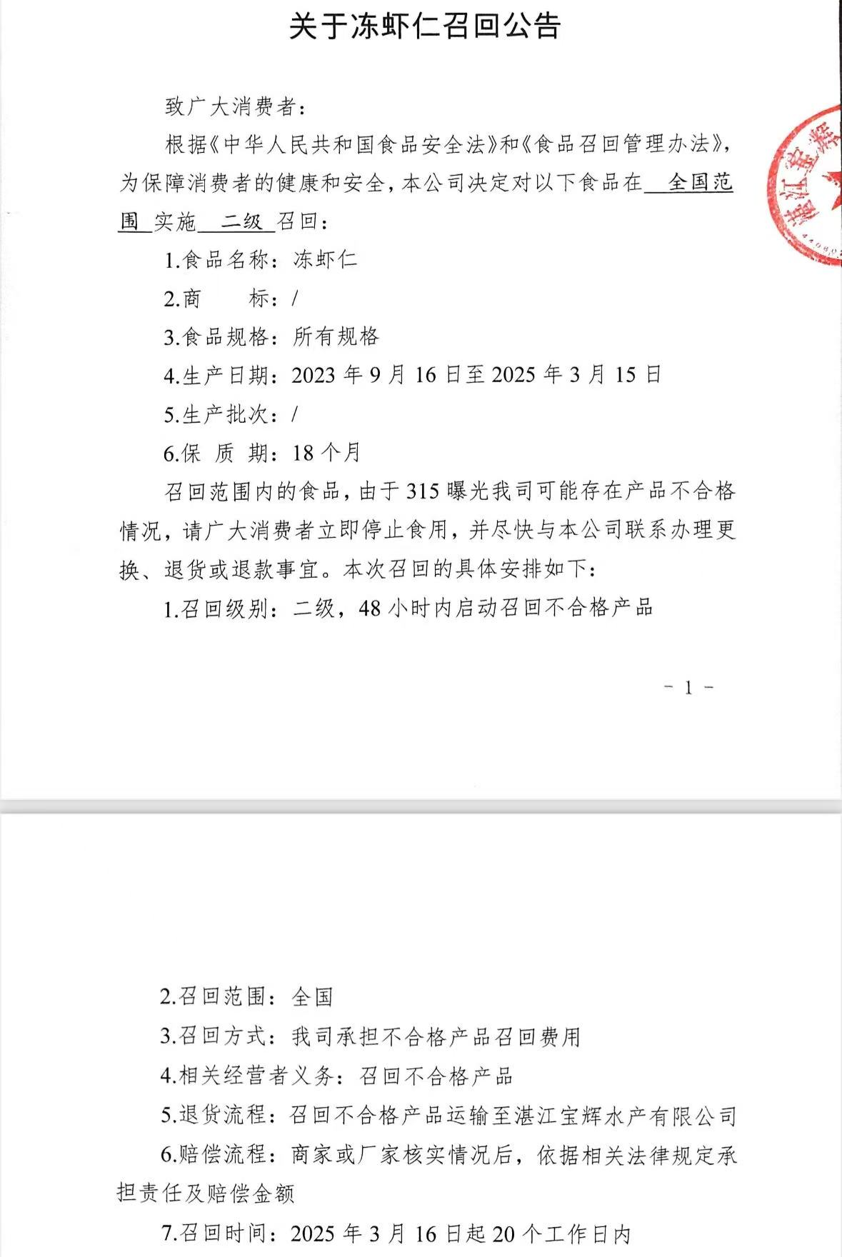 央视315晚会曝光“保水虾仁”问题,涉及广东湛江多家企业。3月16日,湛江市场监督管理局发布食品召回...