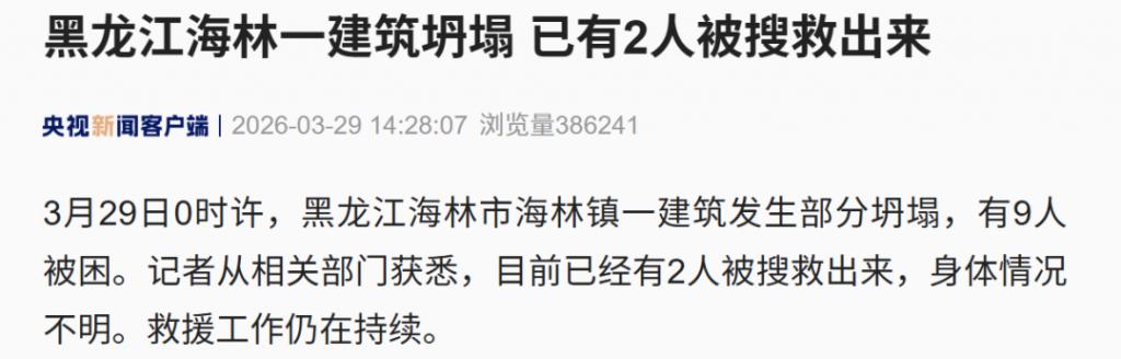 黑龙江海林一建筑坍塌9人被困,已有2人被救出,身体情况不明,救援工作仍在持续综合