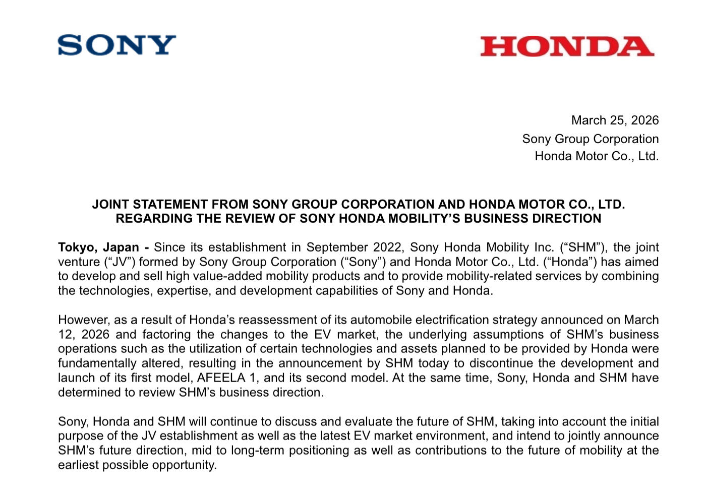 索尼集团与本田汽车周三联合发布声明称,将终止双方合资公司“索尼本田移动出行”(SonyHondaMo...